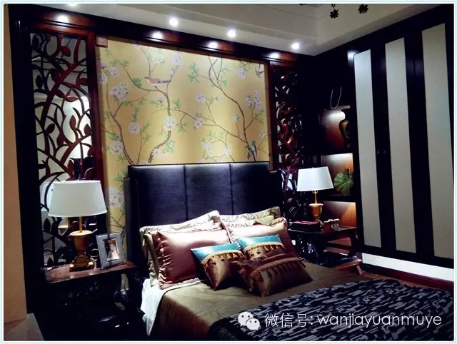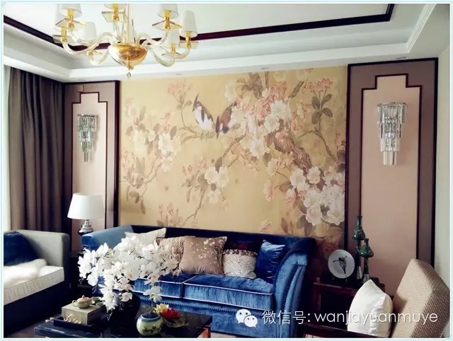 花鸟背景墙带来了吉祥喜气的美好祝愿,烟粉与宝蓝的配色让整个空间显得雅致而古典。