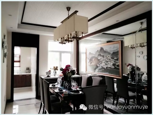 融合了中式现代庄重与优雅的双重气质,用后现代手法把传统的结构形式重新设计组合。木质的庄重与玻璃的轻灵相结合,不但拓展了空间感,而且使整个空间更加灵动而温馨,古人云:“智者乐水,仁者乐山”,墙上的一幅幅山水花鸟佳作与整个木质空间融为一体,瞬间提升了整个空间的艺术感,让人们不禁猜测业主是怎样一位睿智的儒雅居士。