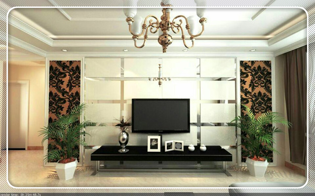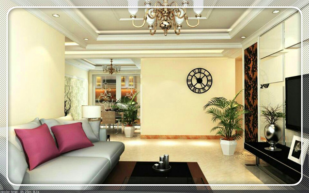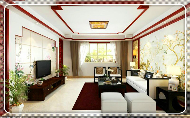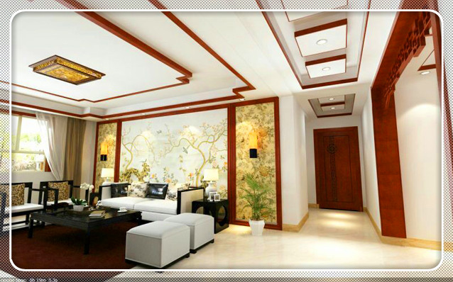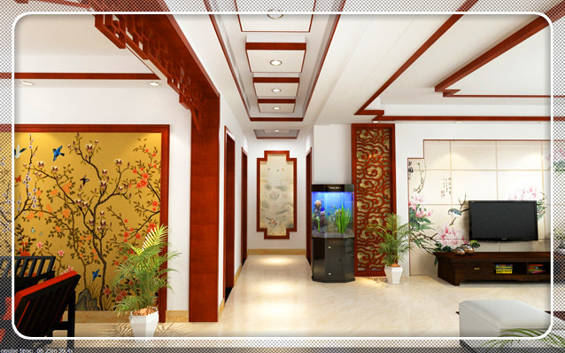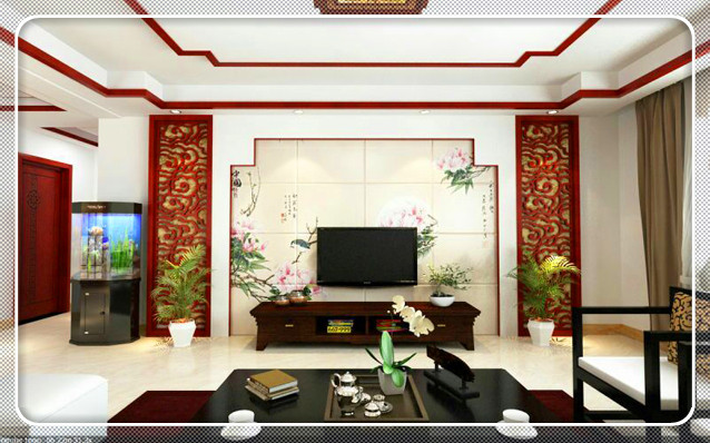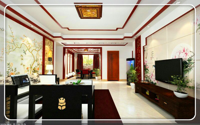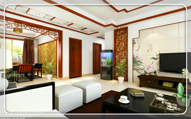 电视背景墙运用木质镂空花格、精巧简洁的花鸟图案大理石铺砌,舒适淡雅的沙发背景墙,将整个客厅衬托得越加完美动人。吊顶的规则造型,复古又时尚,甚是轻盈。