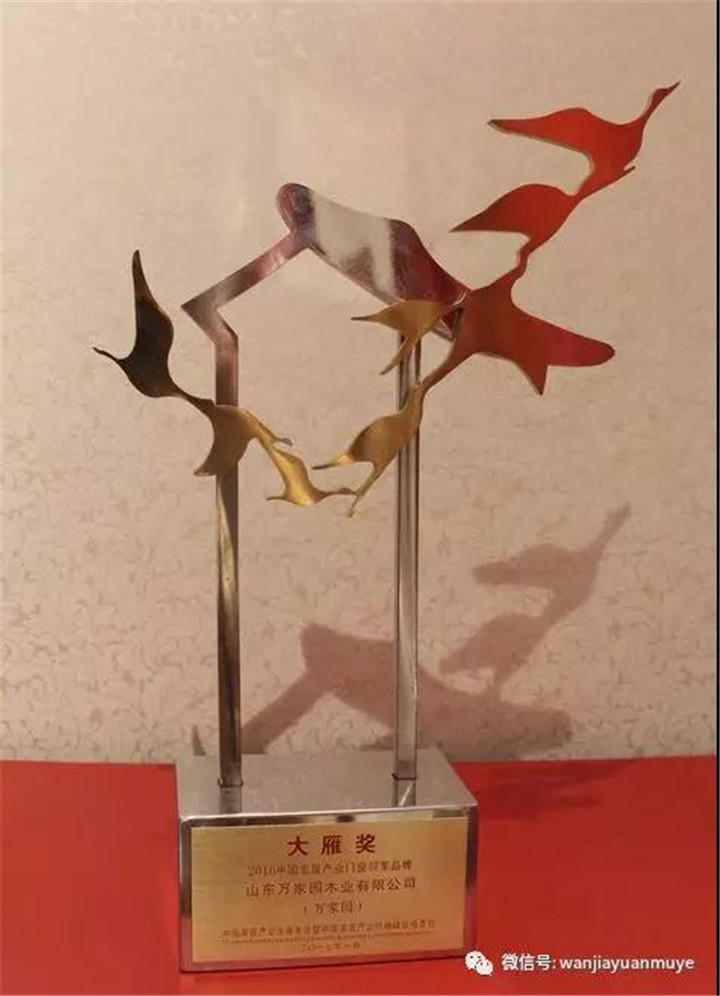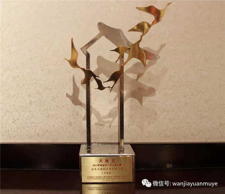 荣誉的背后是万家园不忘初心的匠心坚守,万家园人一直以“万千细节,专为你家”的服务理念,用心做好每一件产品,以精益求精的制造技艺和绿色环保的家装理念诠释未来家居产业发展趋势,向广大消费者提供高端品质的环保家装,同时为家居产业的发展注入强劲的发展活力,助力行业的升级转型。此次荣获“大雁奖”,不仅再一次力证了万家园木业的品牌实力,也进一步提升了万家园品牌在行业内的影响力。