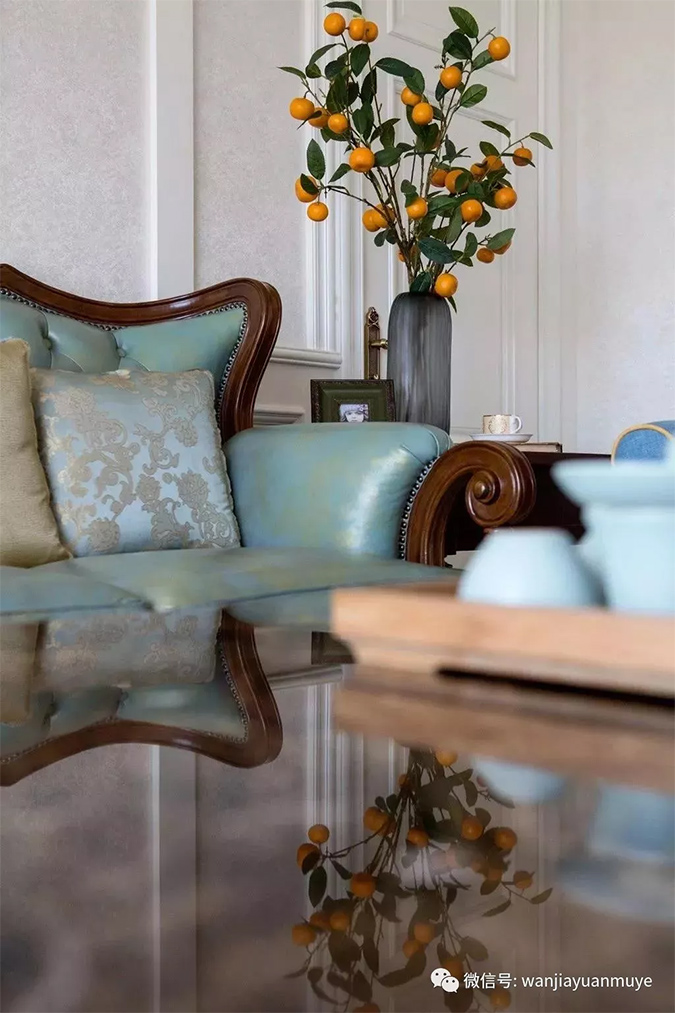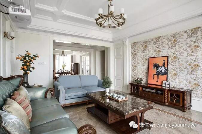 客厅在整体白调的基础氛围下,碎花壁纸电视墙的尽显恬美气息,搭配复古家具特别的华美端庄