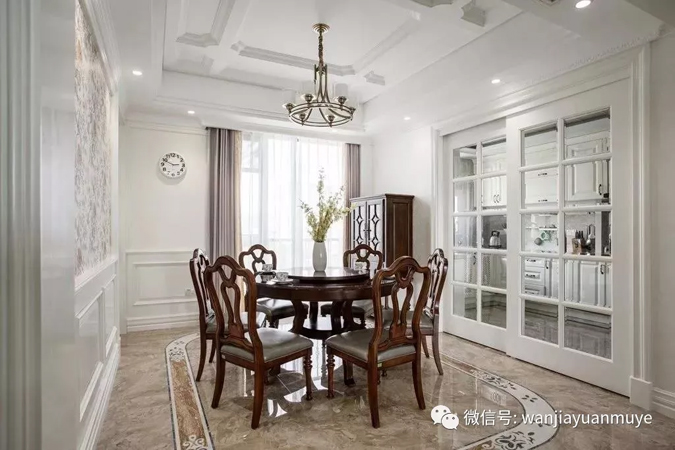 与客厅同色系的色彩和造型突显高贵婉约的用餐情调。