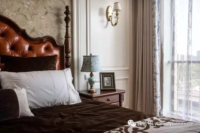 碎花床头墙两边做有边框造型,契合了床头柜和壁灯的布置,加上古典范的皮艺床铺,给人落落大方的既视感。