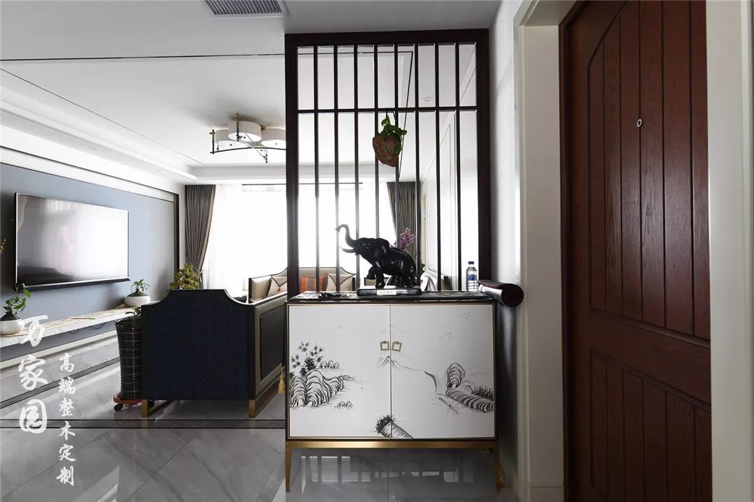 ▲门厅 用简约的古风格栅作为入户隔断,使客餐厅相连,隔而不断、移步换景、光影绰约,将写意的空间烘托入境。