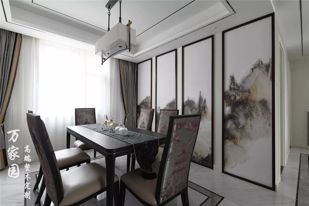 ▲餐厅 水墨画、案几、盆景等传统中式元素得以保留,恰到好处的为空间营造出一个清雅庄重的和谐氛围