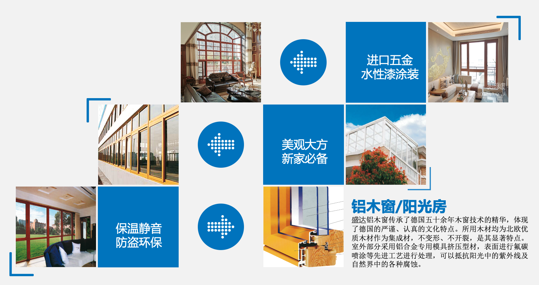 室外部分采用铝合金专用模具挤压型材,表面进行氟碳喷涂等先进工艺进行处理,可以抵抗阳光中的紫外线及自然界中的各种腐蚀。